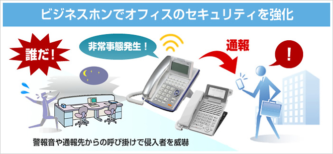 多機能電話機の人感センサーが侵入者を感知し、警告音やランプの点滅でお知らせします。携帯電話など、あらかじめ設定した連絡先に通報し、通報を受けた人はオフィスの電話機のスピーカーを通じて声での威嚇を行うこともできます。