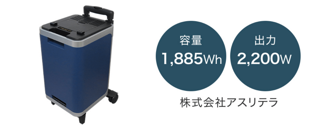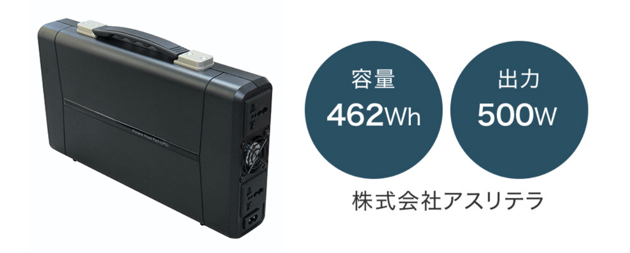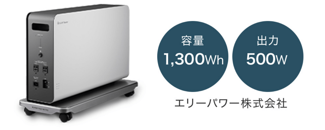 蓄電容量1,300Wh、最大出力500W、質量約40kg。
