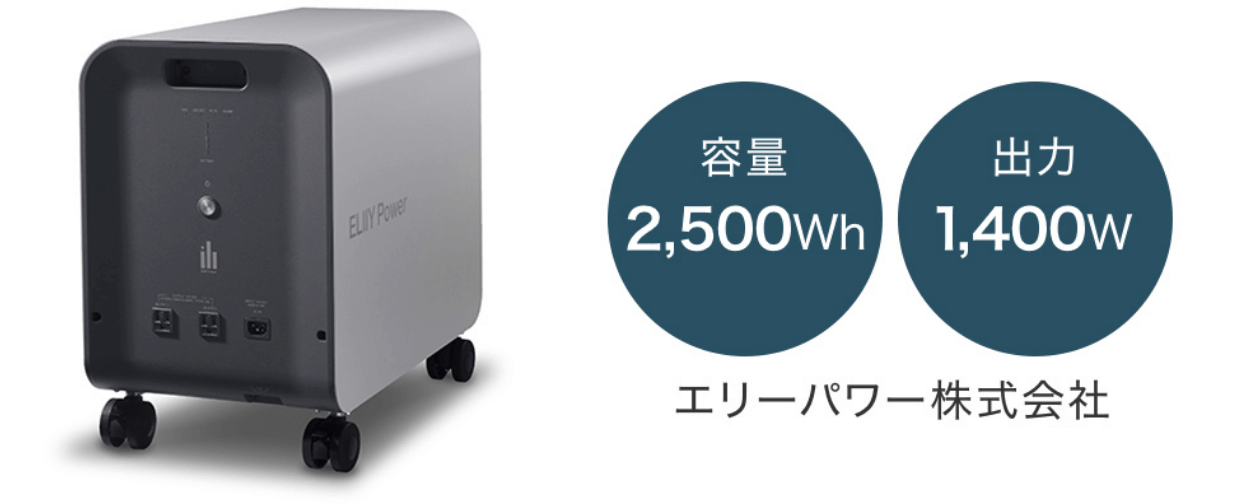 蓄電容量2,500Wh、最大出力1,400W、質量52kg。