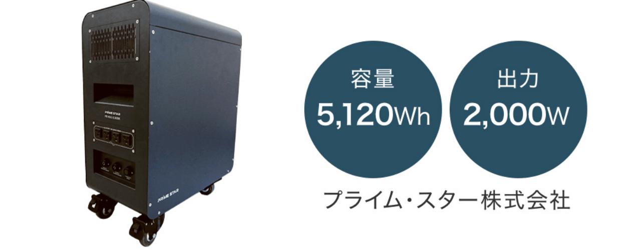 蓄電容量5,120Wh、最大出力2,000W、質量約80kg。