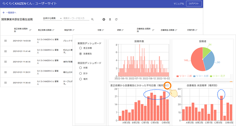 サイト上でダッシュボードを表示できるので、すぐに分析・可視化ができます。また一覧はExcel(画像付き)でもエクスポートできるので従来のExcel作成は必要ありません。