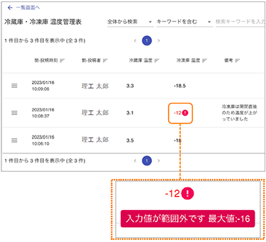 入力した値が範囲外の場合画面上にアラート表示されますので、異常を早期に発見できます。