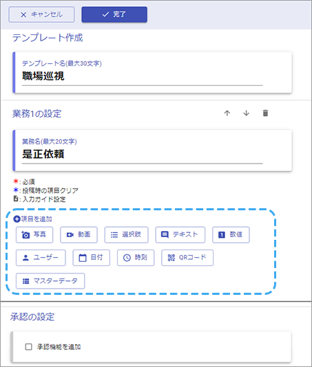 スマートデバイスから入力するフォーマットはwebサイトから入力項目を選択するだけで簡単に作成できます。入力項目は写真、動画、選択肢、テキスト、数値、QR読み取りなど様々な入力方法から選択できます。