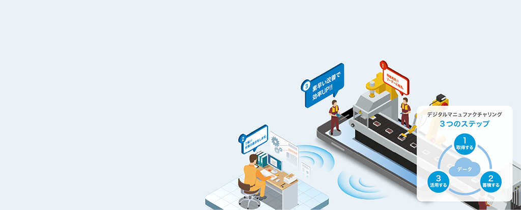 管理者はすばやく改善対策を指示、現場はすぐに対応。現場のデータを「取得」、「蓄積」、「活用」して、いつでも、だれでも、驚くほど短時間に効率良く生産現場の改善活動が行なえます。