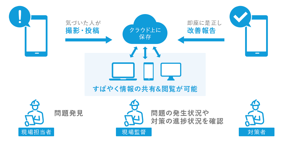 製造現場の従業員が身に着けているスマートデバイスで撮影し、現場の改善をすべき項目を簡単報告。
