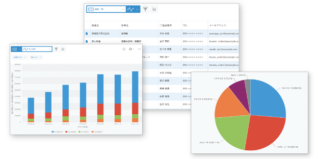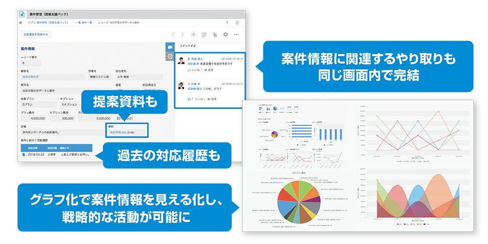 顧客ごとの案件情報や過去の活動の履歴まで⼀元管理し共有できるので、⼆重対応や対応漏れを防ぎます。