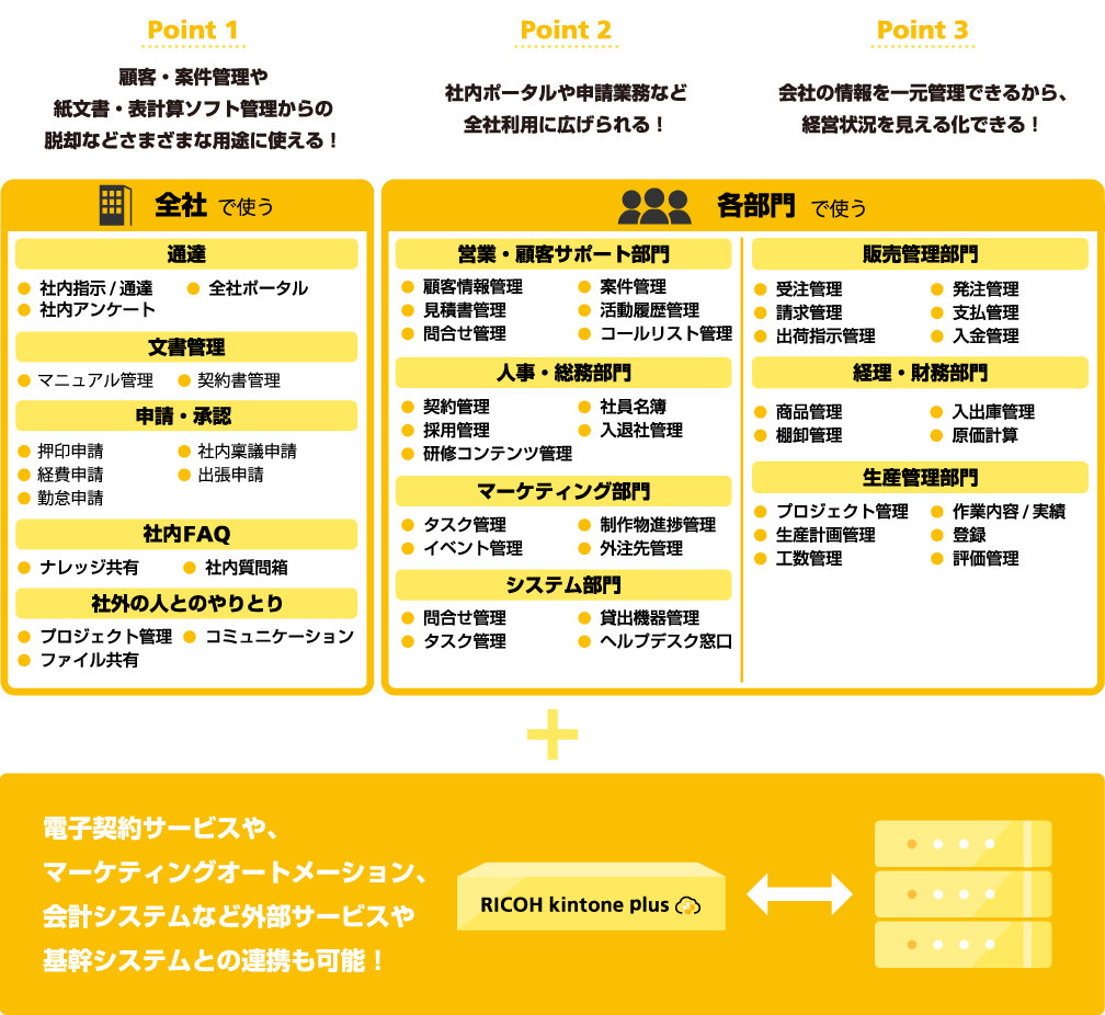 RICOH kintone plusは、さまざまな業種や会社、その中で発⽣する業務へ活⽤できます。