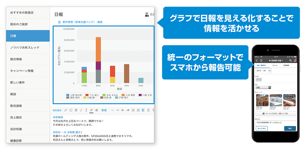 社内・社外の情報共有・コミュニケーションにも役⽴ち、情報の⼀元管理や複数企業間での情報共有にも有効です。