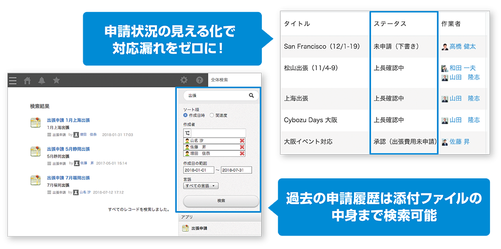 申請⼿段を集約すれば、申請フローを⾒える化できるだけでなく、スマホから承認もラクラク。過去の履歴も残すことができます。