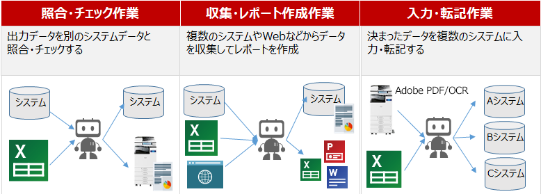 RPAはシステム間や作成データの照合、データ収集をし、各種ソフトでのレポート作成、システムへの転記・入力などに適しています。データのダウンロード、アップロードといった単純な操作での切り口も有効です。