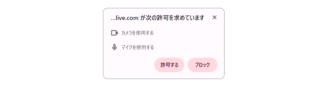 「このブラウザーで続ける」をクリックすると、以下のような画面に移動します。最初にブラウザからマイクとカメラの使用許可を求められるので、「許可」をクリックしましょう。