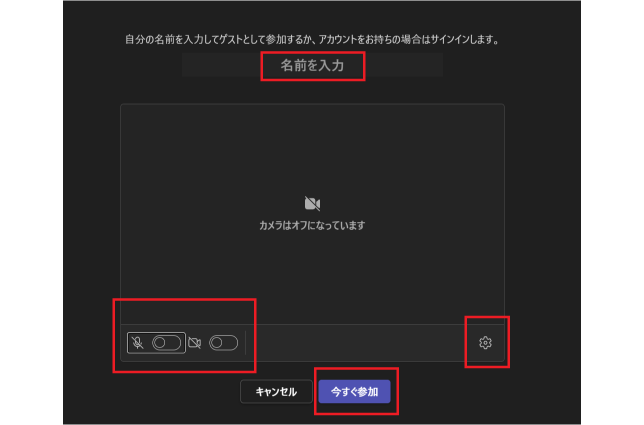 次に名前を入力し、カメラとマイクの設定を行います。設定が完了したら、「今すぐ参加」をクリックすることで、会議の待機画面に移動することが可能です。