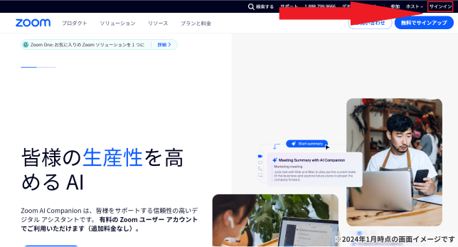最初にZoomの公式ページを開き、右上にある「サインイン」をクリックします。
