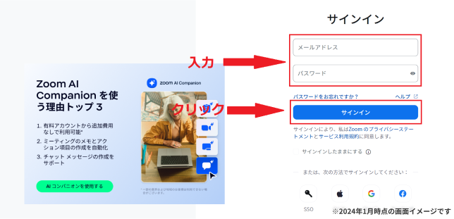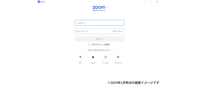 以上でPC版Zoomアプリのログインが完了します。また、ブラウザ版と同様にPC版Zoomアプリの場合でも、SSOやAppleID、GoogleアカウントやFacebook認証でログインすることが可能です。