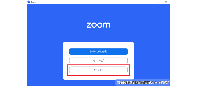 Zoomアプリのダウンロードとインストールが完了したら、Zoomアプリを開きましょう。Zoomアプリを開くと以下のような画面が出現するので、「サインイン」をクリックします。