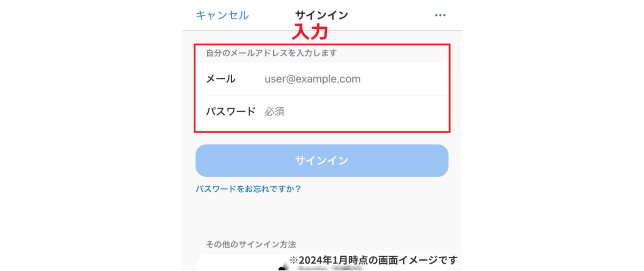 「サインイン」をクリックするとメールアドレスとパスワードを入力する画面になるので、あらかじめ登録した情報を入力の上、再度「サインイン」をクリックしましょう。