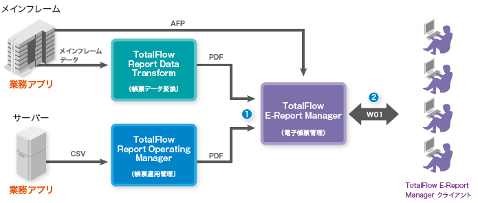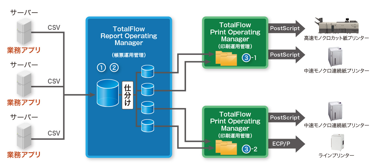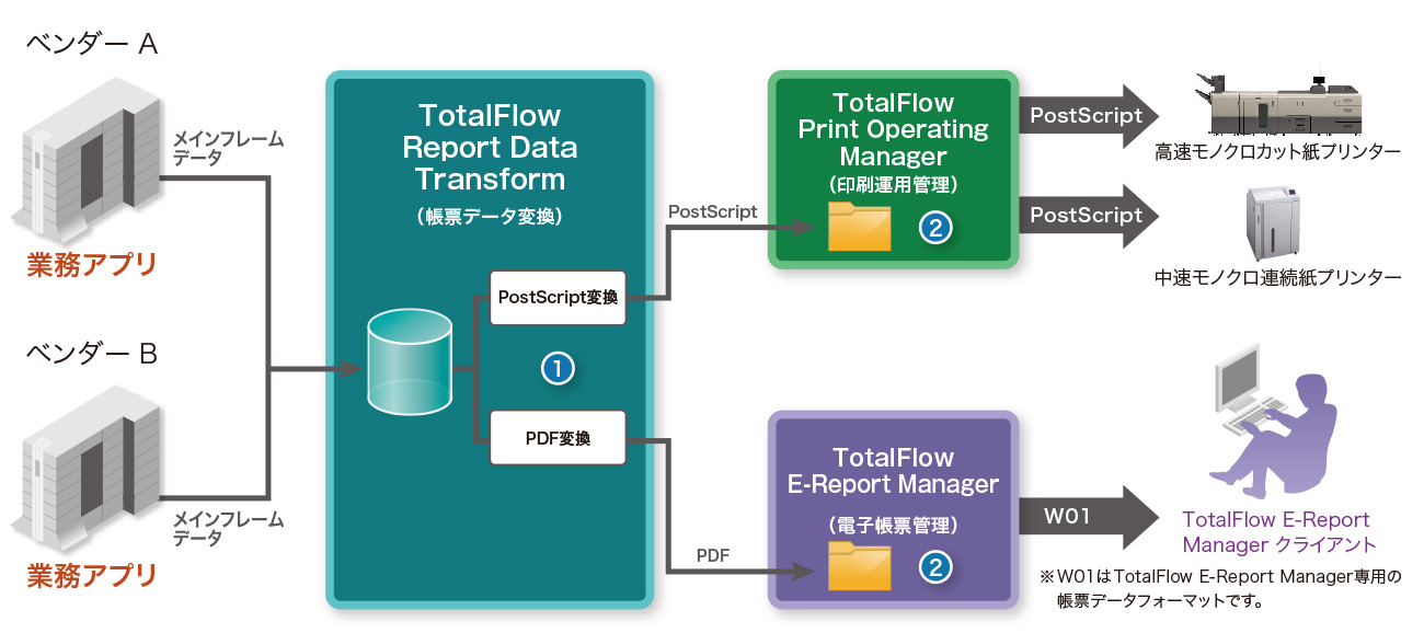 「TotalFlow 統合印刷基盤」は、メインフレームからのデータ入力から、印刷・電子帳票化の出力までの印刷環境を一括してサポート。