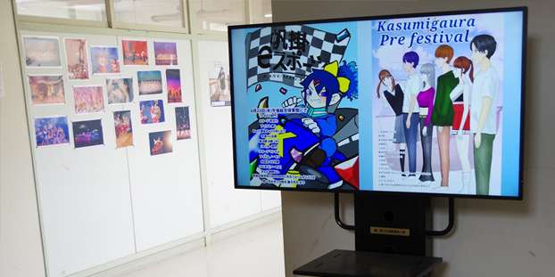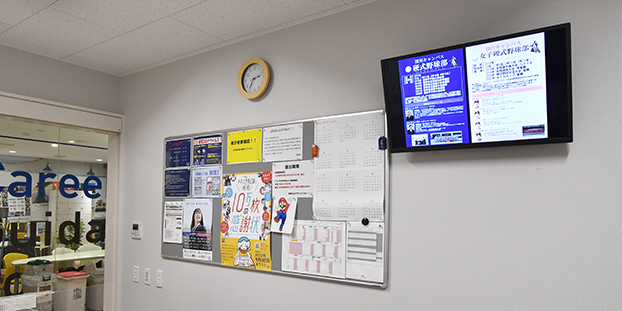 校内各所にて、天気やニュースなどの最新情報から学園祭などの構内情報まで幅広い情報を発信。生徒が作成した掲示物をサイネージで表示し、話題性創出にも活用されています。