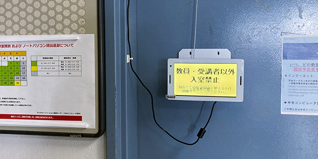 実習室入り口に電子POPを導入し、現在の実習室稼働状況を表示。コンテンツを動画にすることで、学生の目に留まりやすく、訴求力のある情報発信となっています。