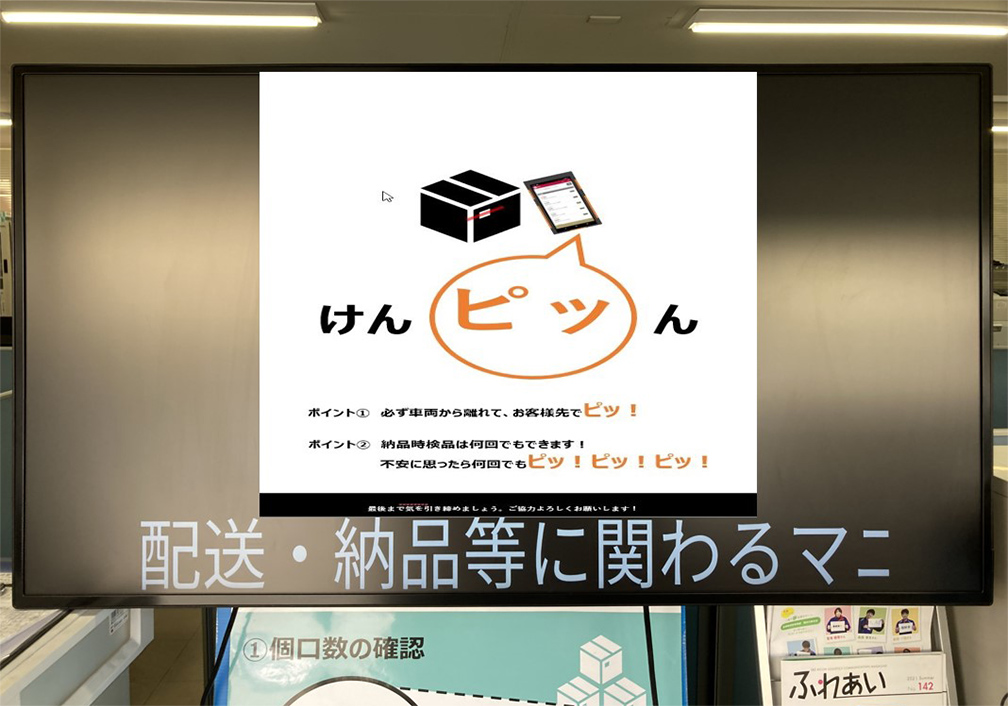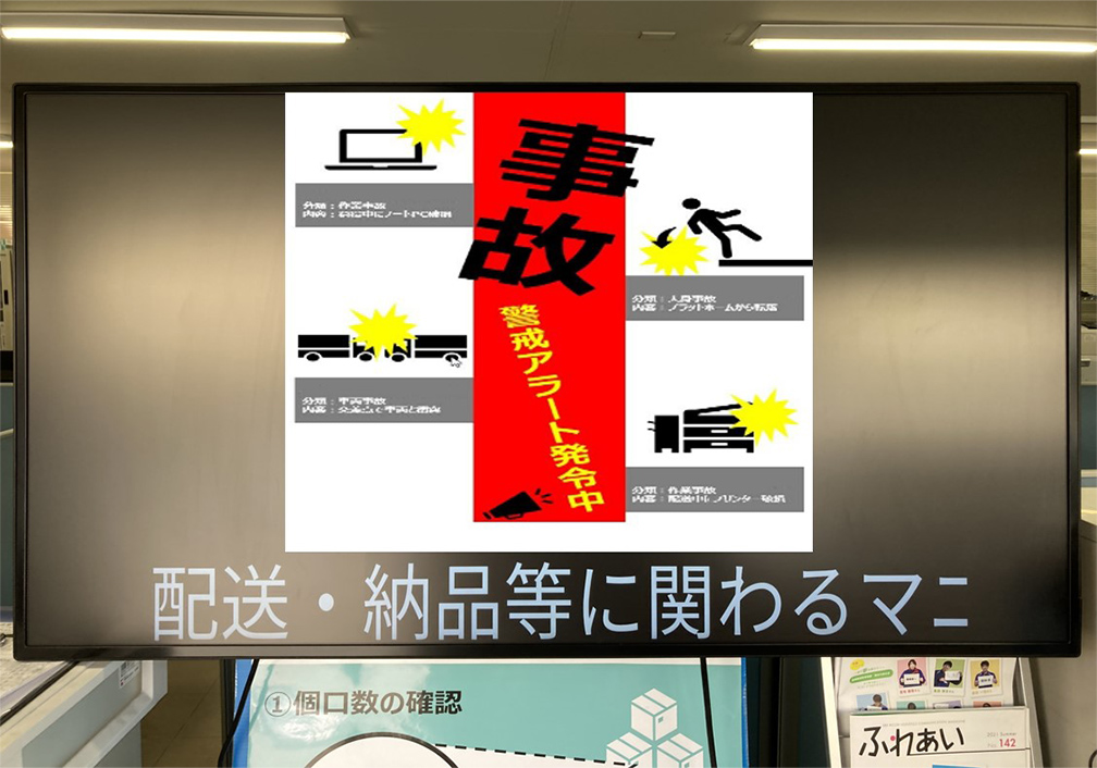 適格な注意事項伝達や、情報伝達、コミュニケーション活性化のツールとして、ドライバーや、社員向けにデジタルサイネージを導入いたしました。今まで紙で手渡していた注意事項の紹介は、動画をサイネージにUPして配信することでインパクトも大きく、また、荷物の積載方法においても画像で表示することにより、誰でもがより理解しやすくなりました。