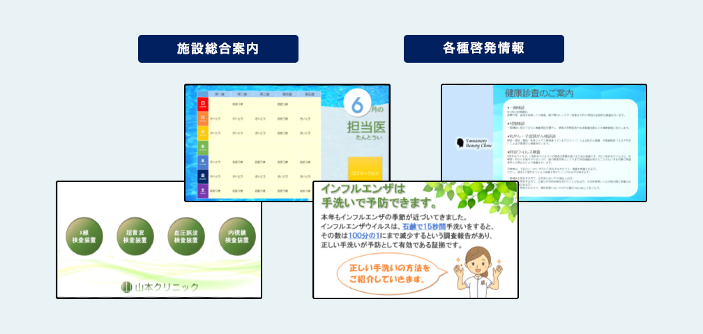 また、関係省庁から届くお知らせ情報や、コロナ禍で受診数が減少しているといわれる人間ドックやがん検診などの各種検診情報をデジタルサイネージで繰り返し配信することで、患者様の受診を啓発し、病気の早期発見や病気を未然に防ぐことが可能になります。