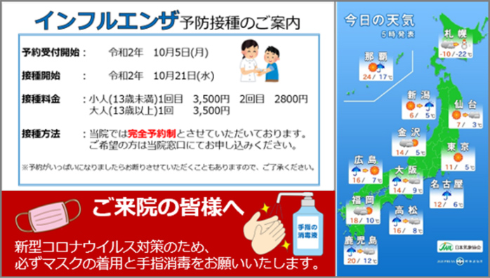 左から、総合案内、担当医、インフルエンザ手洗い予防の啓発、健康診査のご案内