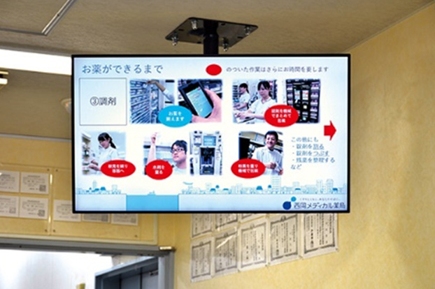 デジタルサイネージを導入し、各店舗の患者さんの層に合わせた商品の紹介や健康アドバイス、薬に関するクイズ、薬剤師の紹介などのコンテンツを配信しています。