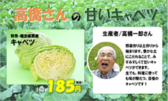 高橋さんの甘いキャベツ、商品と生産者を紹介するデジタルサイネージ例