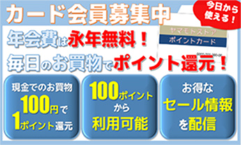 カード会員募集中、年会費は永年無料!毎日のお買い物でポイント還元!