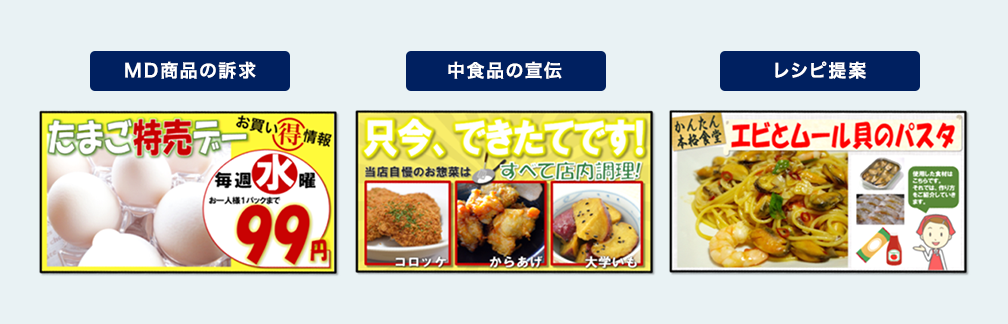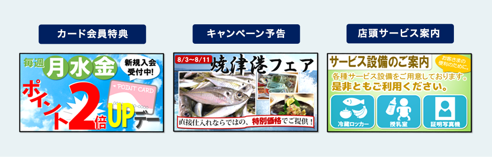 同業他社をはじめコンビニやドラッグストアといった他業種との競争が激化しているスーパーマーケットにおいては、地域密着型の店舗運営が重要視されています。店舗毎の各種施策の効果的な訴求手段(販促施策)としてデジタルサイネージが活用できます。