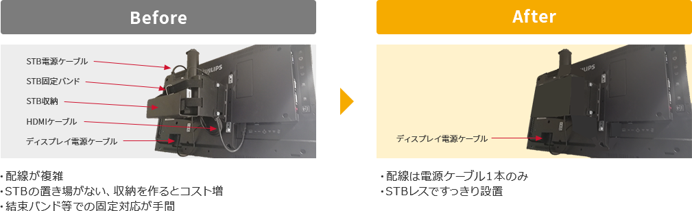 STBレスのため、配線が電源ケーブル1本のみとなり、場所を選ばずすっきりとした設置が可能です。