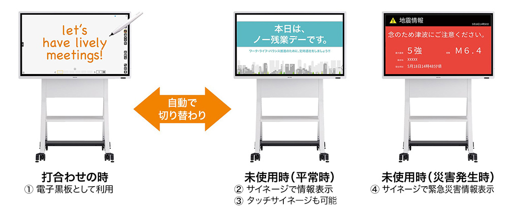 縦置き設置が可能で、4KコンテンツやWebコンテンツにも対応。32/43/50/55/65インチの5サイズ展開で、設置場所や利用シーンを選ばず、さまざまな用途で活用できます。