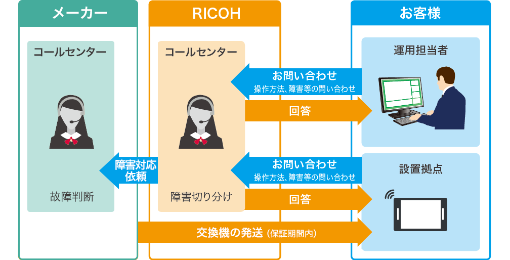 リコーのコールセンターでの障害切り分け後、故障の疑いがあった場合はメーカーのコールセンターへ情報連携され、メーカーのコールセンターから直接お客様へご連絡させていただきます。