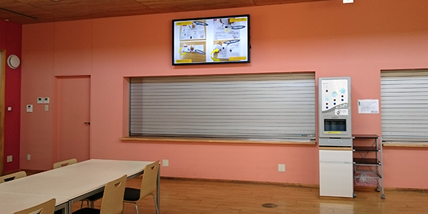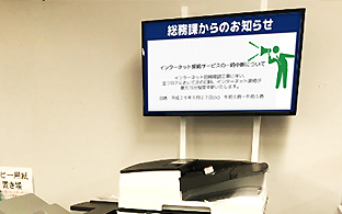 人が多く集まる場所には社内の周知事項や事業所イベントを配信