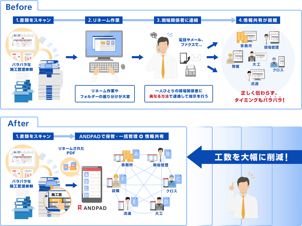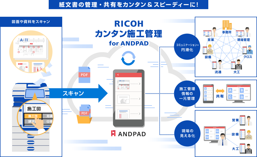 RICOH カンタン施工管理 for ANDPADは、施工管理書類を複合機でスキャンし、登録したいフォルダーを選択するだけで簡単に「ANDPAD」にアップロードでき、一括管理が可能です。現場関係者はPCやスマートデバイスからリアルタイムに「ANDPAD」にアクセスできるため、書類の共有にかかる工数を大幅に削減します。