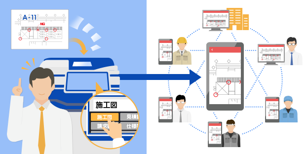 手書き修正・加筆した紙文書をリコーの複合機でスキャンするだけで、工事関係者全員に一括で共有することが可能。情報伝達のミスを少なくできるなど、コミュニケーションの円滑化をサポートします。