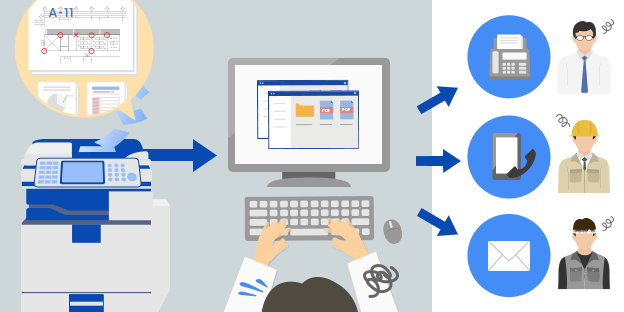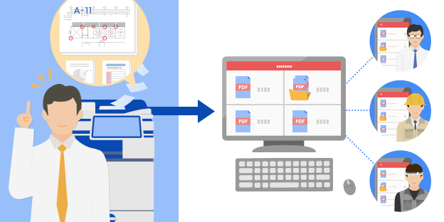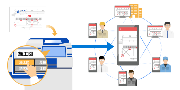 複合機のタッチパネル上から施工管理案件(請求書、施工図など)を選択し、現場やオフィスの紙文書をダイレクトにスキャン。情報をカンタンに一元管理でき、関係者との情報共有もスムーズに行なえます。