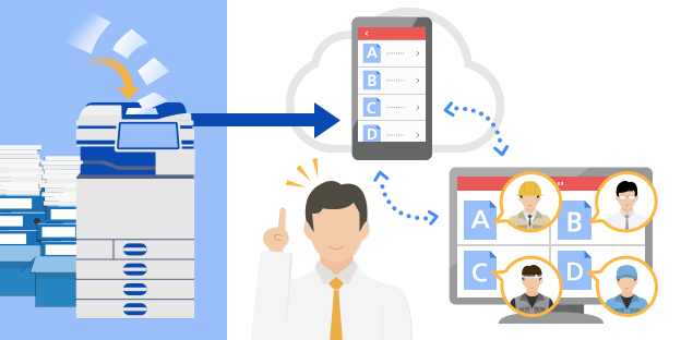 複合機でスキャンした文書をクラウド上にある「ANDPAD」のストレージにアップロード。登録したいフォルダーを選択するだけで一括管理でき、工事関係者にスムーズに伝達することができます。パソコンやスマートデバイスからアクセスできるため、いつでもリアルタイムな情報を共有することが可能です。