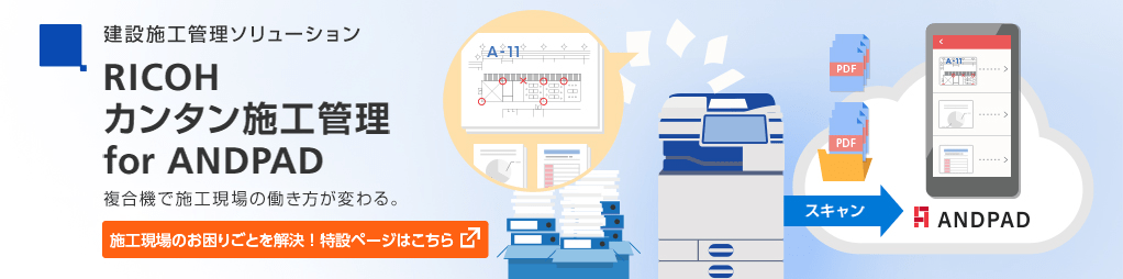 「ANDPAD」は工事関連情報の一元管理・共有をリアルタイムで行なえる画期的なクラウドサービスです。パソコンやスマートデバイスからカンタンに操作でき、施工管理の品質向上を実現します。「RICOH カンタン施工管理 for ANDPAD」では、リコーの複合機と連携することによって大量の紙文書でもスピーディーに処理でき、施工会社や工事関係者の働き方改革を強力にサポートします。