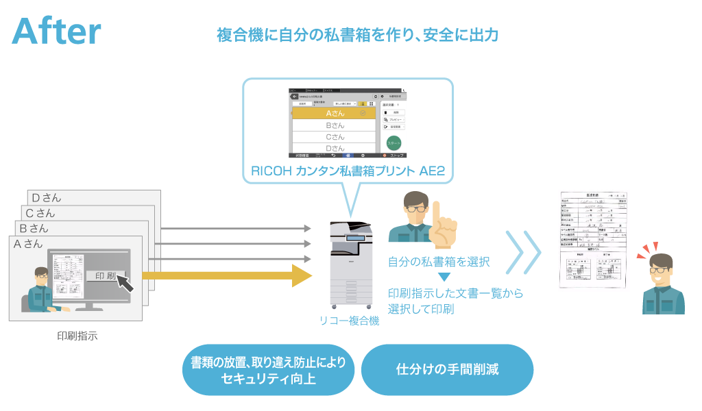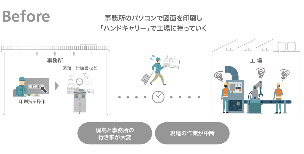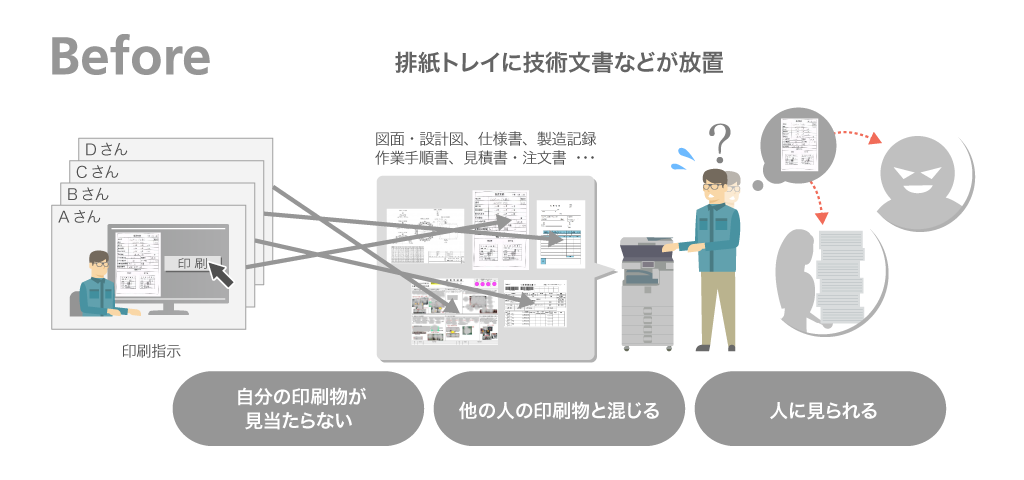 出力した技術書類が排紙トレイに置かれセキュリティが不安、現場で急に書類が必要になり事務所へ行き来し作業が中断・・・といったことはありませんか?