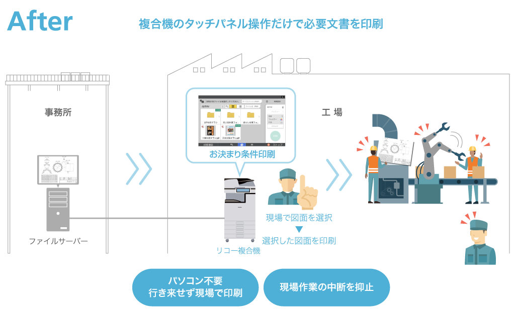 「製造業向け技術書類出力セット」は、このような課題を複合機のタッチパネルの簡単操作で解決。放置文書をなくしてセキュリティを向上するとともに、現場ですぐに書類出力できるアプリケーションパッケージです。月・年単位の定額制だから必要に応じ契約数増減が可能となり、保守サービスもセットで無駄なく安心して継続活用できます。