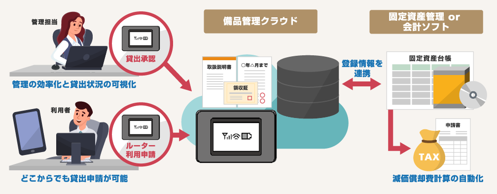 さらに、貸出申請や返却受付の処理もクラウドを通じタイムリーに反映することで備品管理業務全体の課題を解決するソリューションです。