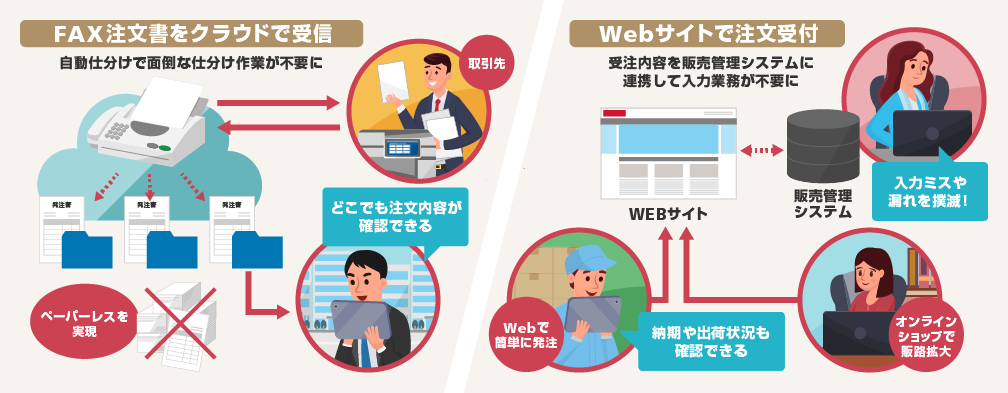 Webで受け付けた注文は販売管理システムへ連携できるため、手間のかかる入力作業が不要になり、入力漏れやミスも撲滅できます。また取引先やお客様もパソコンやスマートフォンから簡単に注文ができるようになるので、顧客満足度の向上にも貢献します。