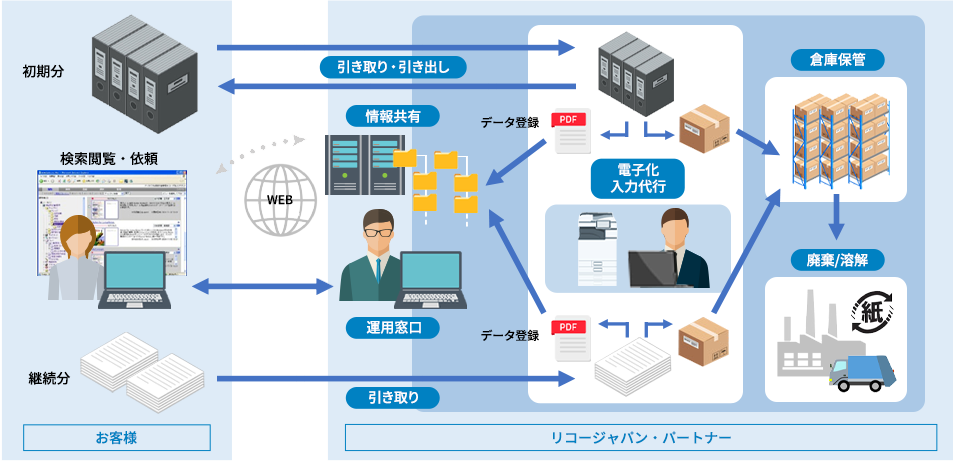 在宅勤務やテレワークを円滑に実施するには、社内紙文書の電子化が必須です。既存の紙文書や日々発生する紙文書のスキャンニング作業/保管管理等のために、わざわざ出社していませんか?「ドキュメントライフサイクルサービスSelect」は、お客様の紙文書を丸ごとお預かりし、スキャニング/目録入力/保管・破棄をトータルでご支援いたします。例えば、「契約書」など日々発生する文書も、月に1度の出社&発送で電子化~保管・廃棄まで柔軟に対応いたします。