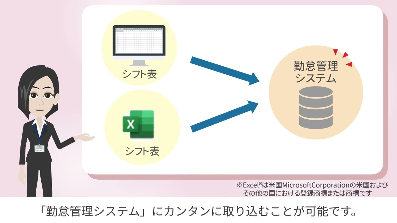 また、現在、「シフト表」を表計算ソフトで作成している施設、事業所では、そのやり方を継続し、フロアーやユニットごとに作成した「シフトデータ」を「勤怠管理システム」に取込み、一覧表してご使用いただくことも可能です。