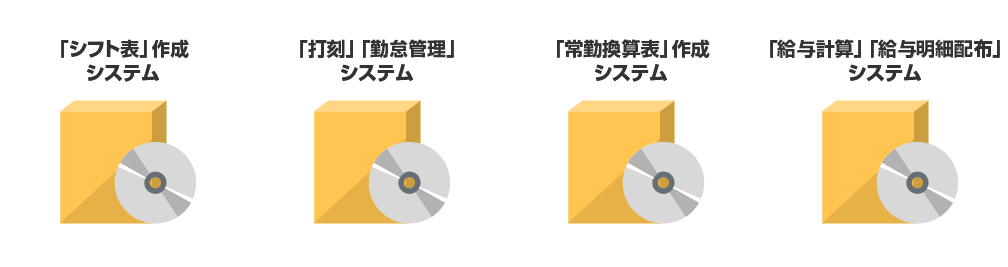 シフト管理、打刻・勤怠管理システム、常勤換算表作成をセット化し、給与計算・給与明細配布システムともデータ連携します。