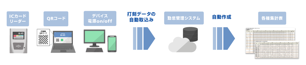 施設や事務所内では、「ICカード」や「QRコード」をタイムレコーダーにかざして記録するやり方、在宅勤務や直行直帰の場合は、スマートフォンやPCの「電源on/off」で出退勤時間を記録、管理できます。