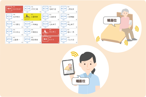 離床前の"起き上がり"や"端座位"はもとより、ずり落ちを予測する"左(右)端活動あり"や車いすからベッドへの移乗を検知する"入床前端座位"等、ご利用者のリスクに応じたアラート設定が可能です。