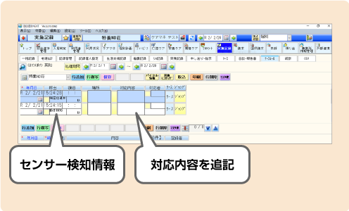 センサーが検知した時間や内容を介護記録システムに自動連携し、対応内容を追加入力できます。 アラート対応時にメモをしておく必要がなくなり、記録のミスや漏れを防ぐことができます。