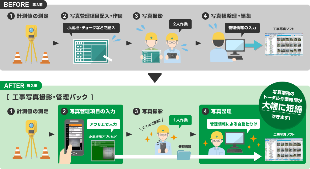 施工現場では毎日、何百枚、何千枚もの工事写真を撮影します。小黒板に工事情報や図をかき、一人がその場で黒板を持ち、一人がカメラのシャッターを押すため、撮影するだけで2名の人手が必要です。